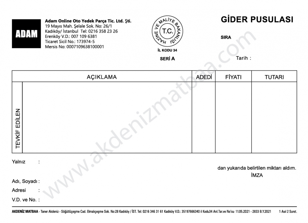 *Gider pusulası basımı resmi bir evrak olduğu için ve resmi evrakların basımının yalnızca anlaşmalı matbaalar tarafından yapılmaktadır. AKDENİZ MATBAA, İstanbul Kadıköy`de Maliye Anlaşmalı Matbaa firmasıdır.