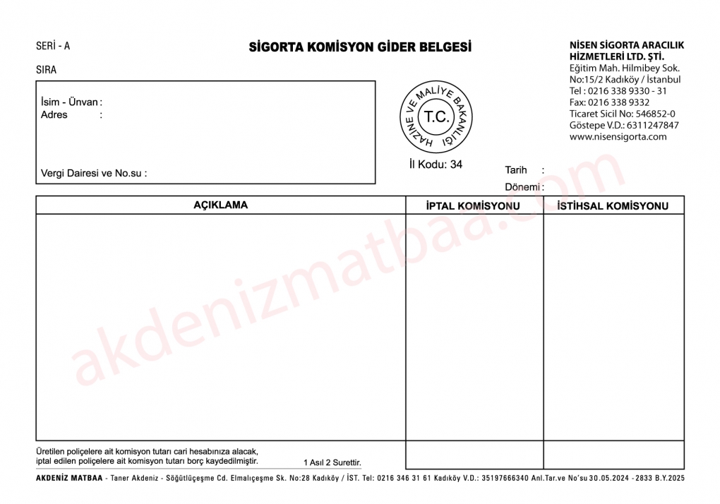 *Sigorta komisyon gider belgesi basımı resmi bir evrak olduğu için ve resmi evrakların basımının yalnızca anlaşmalı matbaalar tarafından yapılmaktadır. AKDENİZ MATBAA, İstanbul Kadıköy`de Maliye Anlaşmalı Matbaa firmasıdır.